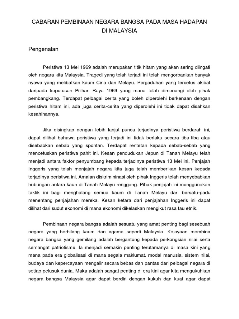 Konsep satu negara bangsa mempunyai makna yang luas kerana konsep itu merujuk kepada sebuah negara yang. Sistem ahli yang diperkenalkan oleh british di tanah melayu telah meninggalkan corak pemerintahan dan pentadbiran yang cemerlang terhadap negara kita pada masa kini. Ota yhteyttä sivuun mpu21032cabaran dalam pembinaan negara bangsa messengerissä. Antara cabaran utama pembinaan negara bangsa malaysia adalah menjadikan malaysia sebagai sebuah negara maju mengikut acuan sendiri. Cabaran pembinaan negara bangsa kesan dasar pecah dan perintah 13 mei 1969.